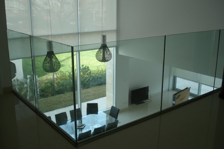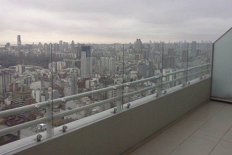Descripción: Consiste en cristales soportados por parantes reforzados de aluminio fijados a la losa que permiten una muy fuerte y robusta barrera vidriada.