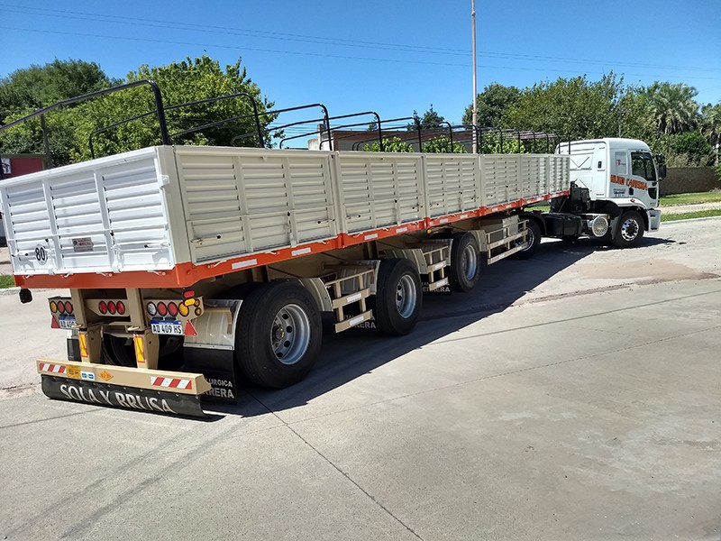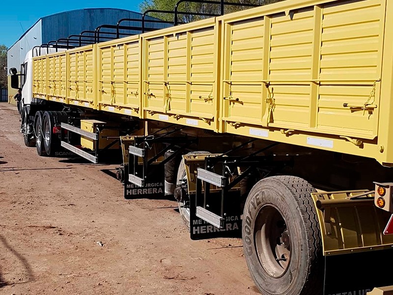 Descripción: Equipo Metalúrgica Herrera, UNO más UNO más UNO. Tanto las barandas como los parantes están construidos en chapa plegada, revestido en chapa plegada (doble decapada/galvanizada), todo puertas, laterales volcables, portón trasero de apertura total con puertas volcables para descarga de cereal, incluye atalonas, arcos, cajón de herramientas, tanque de agua y boquillas.